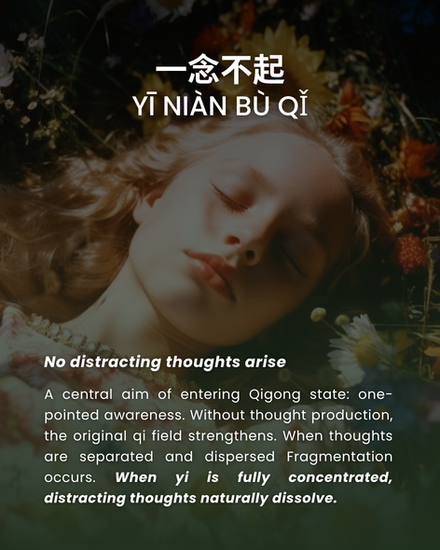 Practitioners aim for a state of consciousness and connectedness described in the 8 verses of Zhineng Qigong. Namely, "Mind is clear and appearance is humble" (Xin chéng Mao gong), eliminating "distracting thoughts" (Yi Nian bu qi), and allowing the "Mind [to expand] into infinity space" (Shen Zhu tai kōng). This leads to feeling "The entire body is harmonised with Qi" (Zhou Shen Rong Rong). The ideal state is described as empty yet not empty, with a mind that is flexible, sensitive, clear, pure, quiet, and still, capable of receiving and sending information effectively. If you’re interested in learning the 8 verses, check out this post.